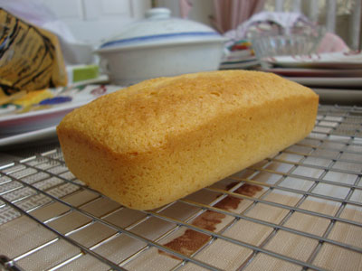 Nyan said it was too buttery(!?) Never mind, I don't trust her judgment much. The cake did taste better and was moister the next day. I find it a tad too dry, though. It wasn't as soft-looking as the original blog pic. But it's not bad either, (tastes quite good out of the oven actually), so I'll definitely be making this again next time I need a simple pound cake recipe.